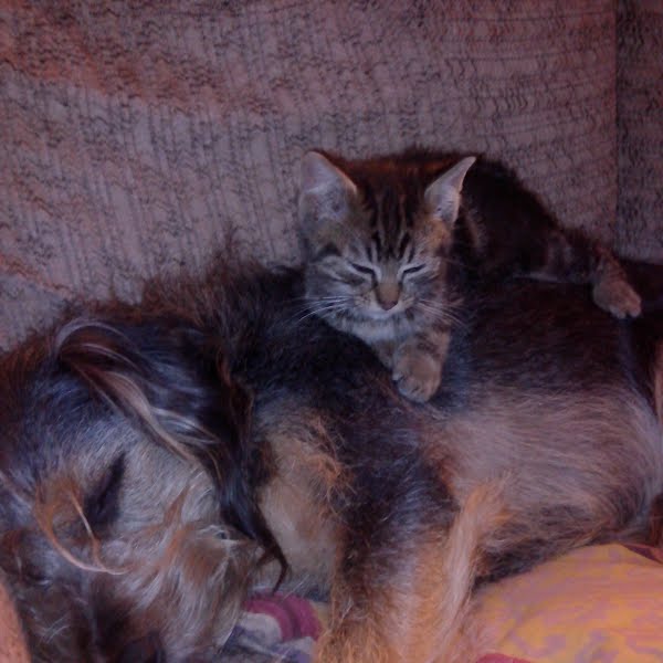 Hehe! C'est pas toujours évident. On a eux le chat peut être 2 semaines avant cette photo et c était un chat sauvage. Il c'est habituer aux 3 chiens tout de suite :)