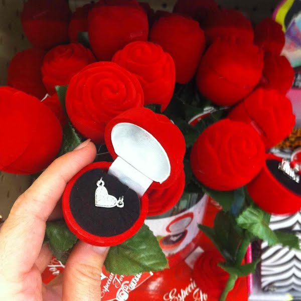 A for irony. Diamond-'esque' heart necklace in a tacky hinged 'rose.' $4.99... Keep it classy, Walgreens.