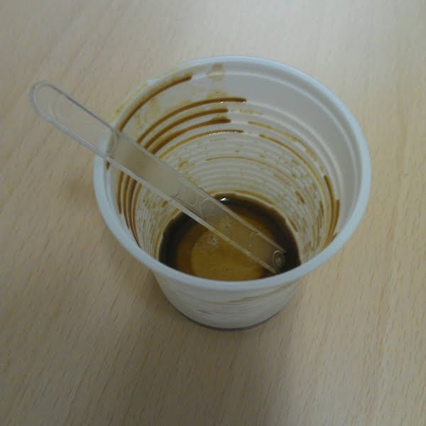 A used plastic cup of espresso