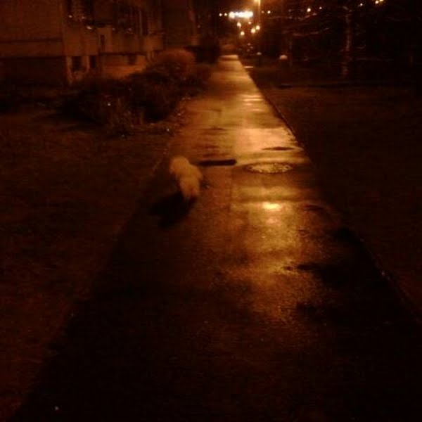 Walking a white dog in the rain