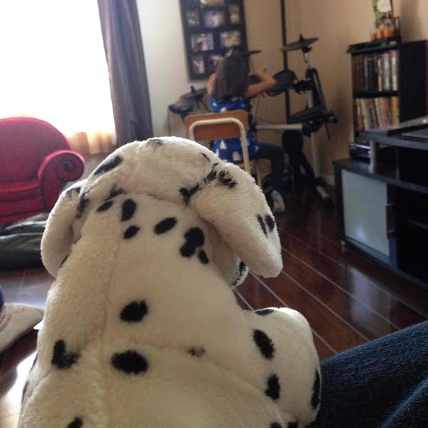 Little Girl Playing Drums While Puppy Watches.