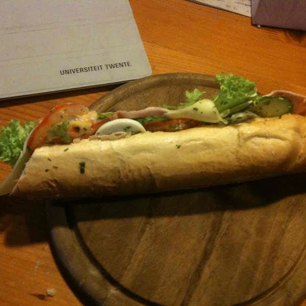 Half baguette with cheese, ham, egg, cabbage, and mayonnaise