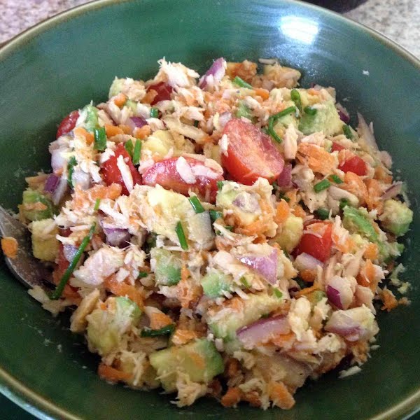 Avocado, Tuna, Tomato, And Rooster sauce Salad.
